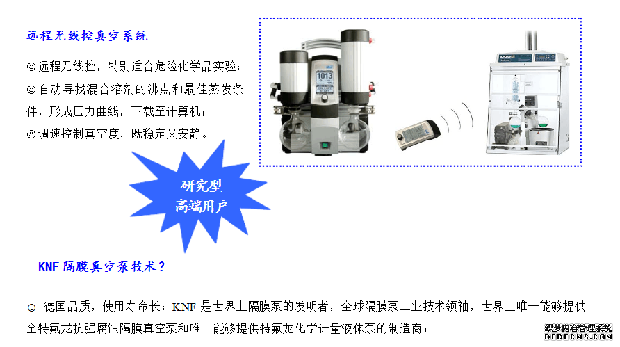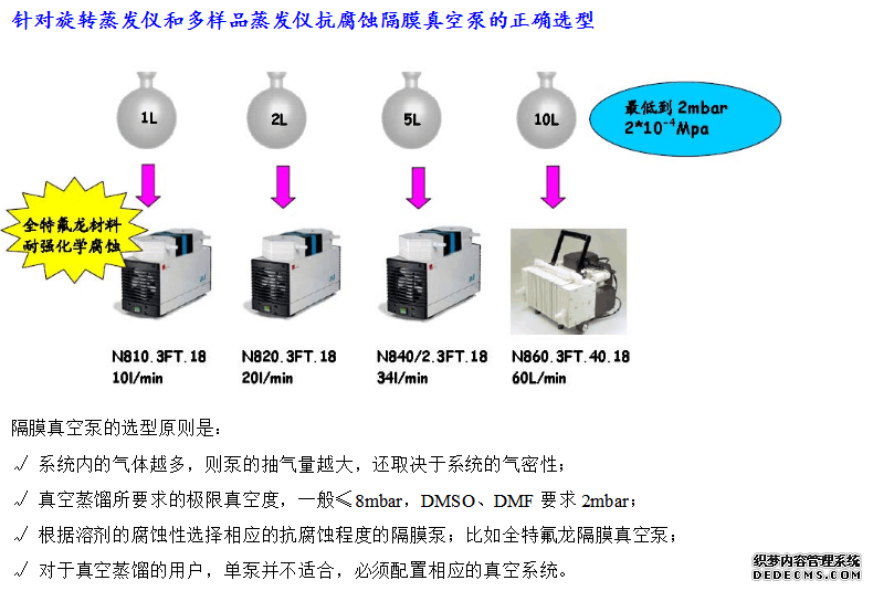 答:旋轉蒸發儀、多樣品蒸發儀需要配真空泵才能使用,一般以水循環真空泵和隔膜泵較常見,而油泵較少見。隔膜泵比水循環真空泵可達到更高的真空度,因此水循環真空泵在蒸餾高沸點溶劑時很慢,如有機實驗室常用的DMSO。KNF全特氟龍隔膜真空泵抗強化學腐蝕,如HCl、HNO3、HF、甲苯、氯仿等所有化學物,且能完全回收,不會飄散出去污染環境和影響健康。在歐盟G家出于對環境保護的考慮,已禁止使用水循環真空泵;而在日本則立法強制要求廢水處理達標后才能排放。因此樣品內含有機溶劑,建議用隔膜泵較好。