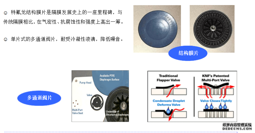 多通道特氟龍閥片特氟龍泵頭 答:一個安裝在偏心曲軸上的彈性膜片(見圖)在電機的帶動下做上下往復運動,使得腔體發生形變,實現介質的抽入和排出。泵在轉移,疏散及壓縮的過程完全無油,實現無污染傳輸。
